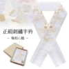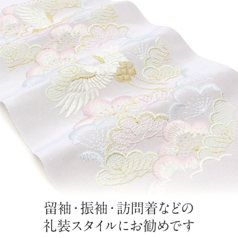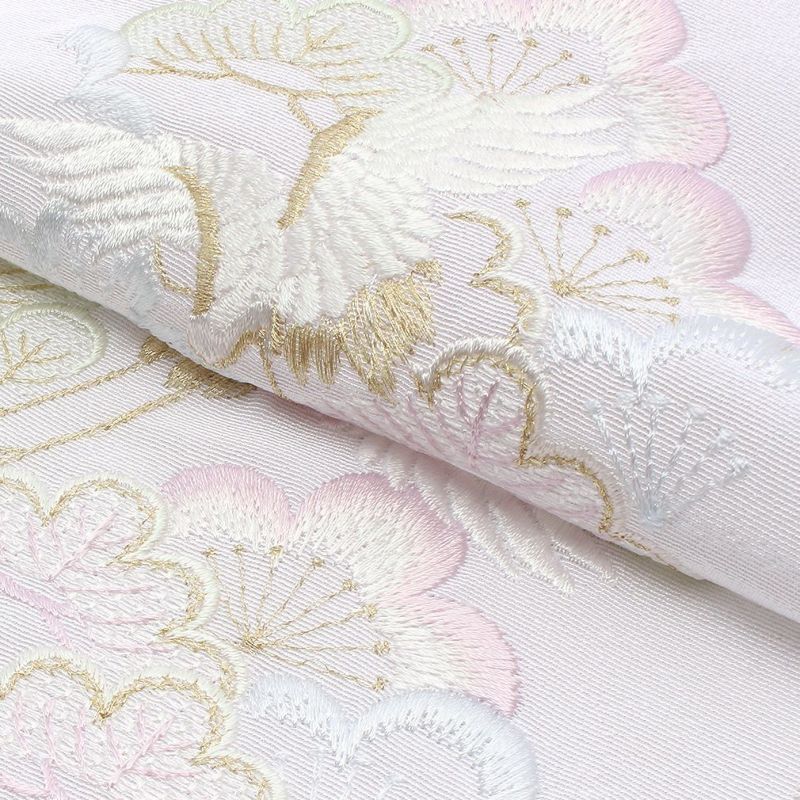 襟元を華やかに彩る、格調高い正絹刺繍半衿です。 しっとりと重みのある塩瀬生地は、上等な厚みが手触りから感じられる逸品。 清らかな白地をベースに、梅の花や松、鶴などの縁起の良い紋様を豪華にあしらった上品な半襟です。 一段と目を引く鶴は金糸が輝き、淡い色合いの梅と松が全体を艶やかに彩る煌びやかな仕上がりとなっております。 刺繍をふんだんに施している為、ふっくらとした生地感です。 程よいボリューム感がある衿元は、お着物の格を高める効果が期待されます。 専用の桐箱に入れてお届けいたします。 華やかな帯や小物を合わせて、結婚式、披露宴、成人式、式典など、フォーマルな場面におすすめです。