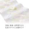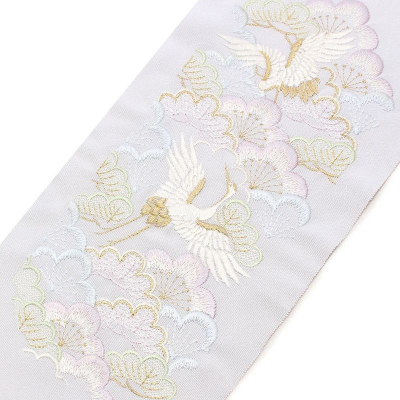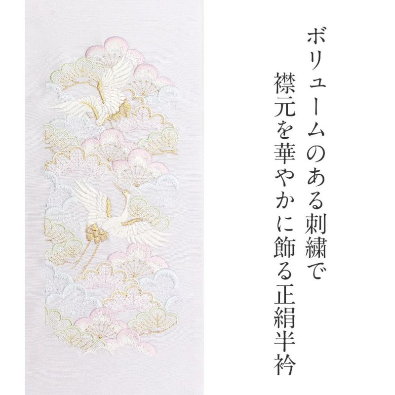 襟元を華やかに彩る、格調高い正絹刺繍半衿です。 しっとりと重みのある塩瀬生地は、上等な厚みが手触りから感じられる逸品。 清らかな白地をベースに、梅の花や松、鶴などの縁起の良い紋様を豪華にあしらった上品な半襟です。 一段と目を引く鶴は金糸が輝き、淡い色合いの梅と松が全体を艶やかに彩る煌びやかな仕上がりとなっております。 刺繍をふんだんに施している為、ふっくらとした生地感です。 程よいボリューム感がある衿元は、お着物の格を高める効果が期待されます。 専用の桐箱に入れてお届けいたします。 華やかな帯や小物を合わせて、結婚式、披露宴、成人式、式典など、フォーマルな場面におすすめです。