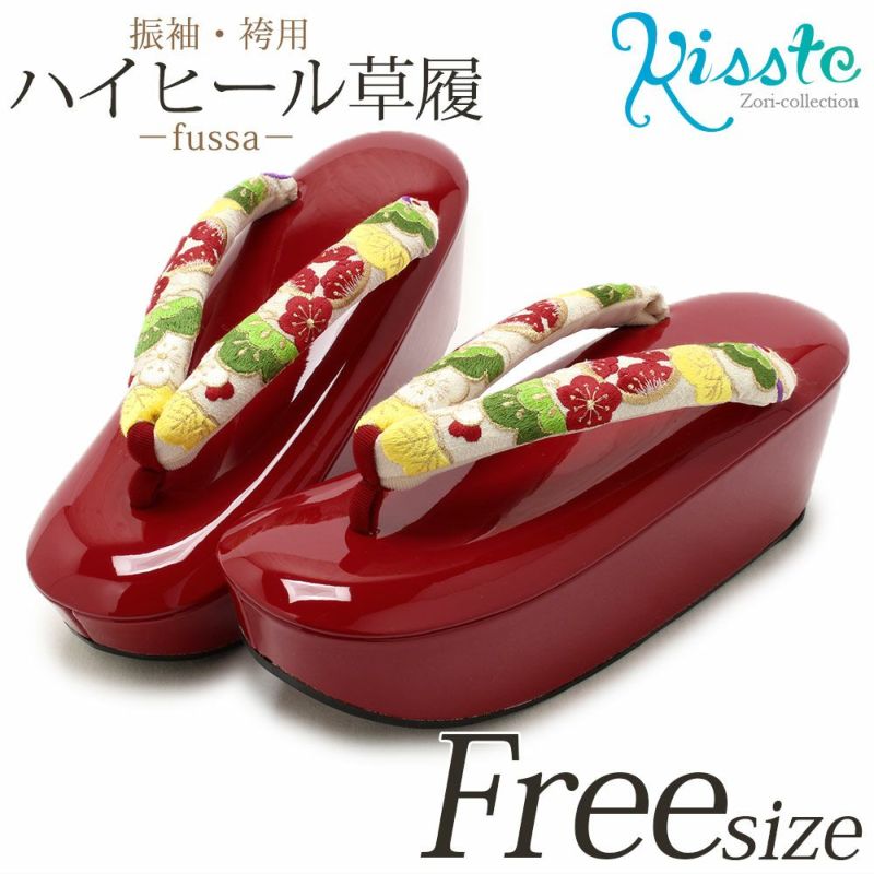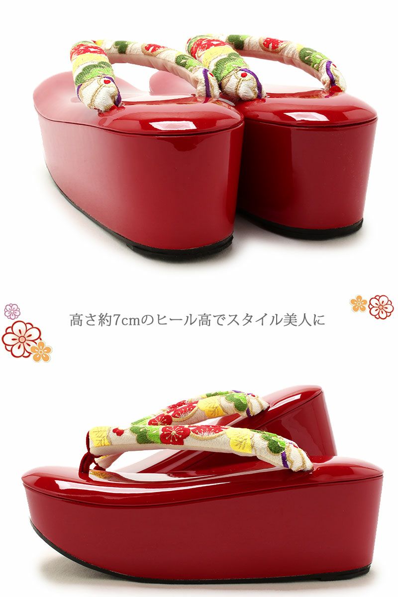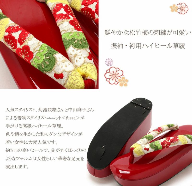 草履 成人式 振袖用 <fussa> Lサイズ フリーサイズ 日本製 厚底 ハイヒール こっぽり ぽっくり <赤/松竹梅 刺繍>