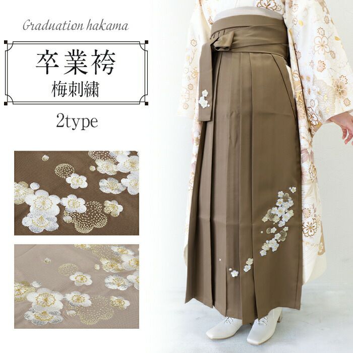 卒業式などのハレの日を彩る、おしゃれな袴スタイルです。 ワントーンカラーの袴ははシンプルな色使いなので、お手持ちの二尺袖にはもちろん、華やかな振袖や古典的なママ振り等にもイメージしやすく、コーディネートの幅が広がります。 金銀白に煌めく梅の刺繍が袴の裾や紐にも施され、着姿を可愛らしく華やかに彩ります。 袴の中に仕切りがない行灯袴(あんどんはかま)なので、振袖等の丈の長い着物にも合わせやすく、普通のスカートのようにお召しいただけます。 上質なポリエステルを使用した袴は、ペラペラ感やテカリのないしっかりとした生地感です。 正絹と異なり、ご自宅でもお手入れしやすいので、汚れを気にせずに袴スタイルをを楽しめます。 袴の後ろ側には伸縮性のあるヘラが付いています。 ヘラは、着付けの時に袴下帯と背の間に深く差し込むことで着崩れ防止になり、万が一後紐が解けてしまってもヘラが刺さっているので、袴が落ちる心配がありません。 届いてすぐに使える、お仕立て上がりの袴です。 合わせやすい3色のカラー展開と、3サイズをご用意しました。 お手持ちの着物に合わせて、お好みの色をお選びください。