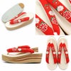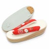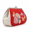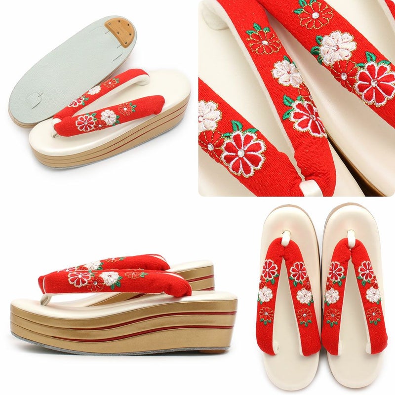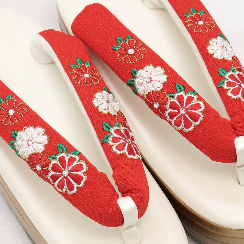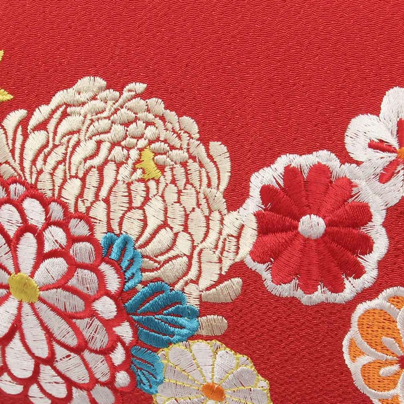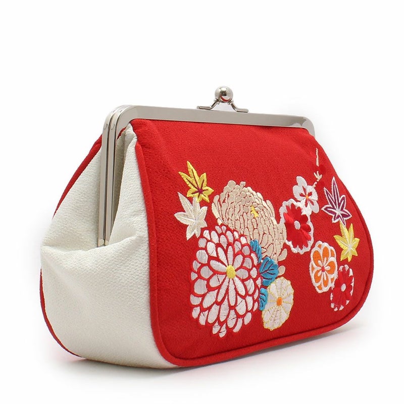 鮮やかな赤と白のちりめん地のバッグには菊や紅葉の刺繍が施され、振袖姿に相応しい可愛さと華やかさのあるデザインです。 バッグは、2通りのパターンでご利用いただけます。 (1)チェーンをバックの中に入れて、クラッチバックとしてお使いいただけます。 (2)チェーンを出して、ハンドバックとしてお使いいただけます。 携帯電話やお財布など、必要なものが入る程良い大きさです。 草履の花緒は菊づくし柄の古典柄が可愛いデザイン。 草履台はかかとの高さは約6cmと程良いヒール高。 歩きやすくとても履き心地がいい逸品です。 成人式や卒業式、謝恩会といった振袖スタイルに最適な、ちりめん刺繍入りの振袖用草履バッグセットです。