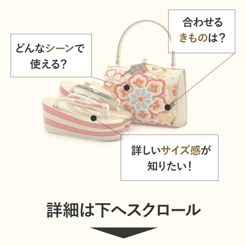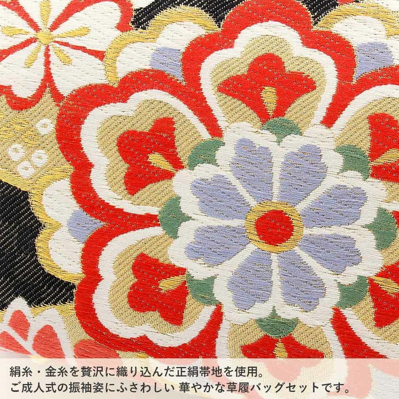 正絹帯地を使用した振袖用厚底草履バッグセットをご用意致しました。 バッグ生地と花緒には、金糸、色糸をふんだんに使用した大きな華紋が織り込まれており、振袖スタイルに相応しい豪華で華やかさのあるデザインです。 バッグと同じデザインの草履の花緒が統一感をプラスし、お着物姿をより一層華やかに。 艶やかで光沢のあるエナメルの草履台はゴールドとレッドの4枚芯ハイヒール。柔らかなクッション加工が施された履きやすさ抜群の逸品です。 かかとの高さは約7.5cmのヒール高で、小柄なお嬢様はもちろん、身長の高いお嬢様の着姿をも美しく魅せ、歩きやすく足への負担を軽減します。 バッグの容量は、お財布やスマホなどが入る程良い大きさ。開きも大きく 小物の出し入れがスムーズに出来ます。 他の人とは違うオシャレにこだわりたい、そんなお洒落女子におススメする、ワンランク上の草履バッグセット。 成人式の振袖を始め、卒業式の袴や結婚式のお呼ばれなど華やかな着姿にご利用いただけます。 着姿をスタイルよく魅せてくれる美しい草履や豪華な花紋のバッグを、大切なハレの日にぜひご活用下さい。
