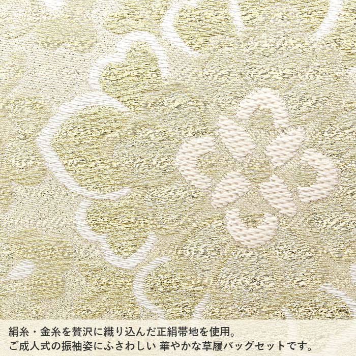 4. 草履バッグセット 成人式 振袖用 卒業袴 成人用 Sサイズ 金 ゴールド ホワイト 華紋 正絹帯地 2枚芯 優花緒 日本製