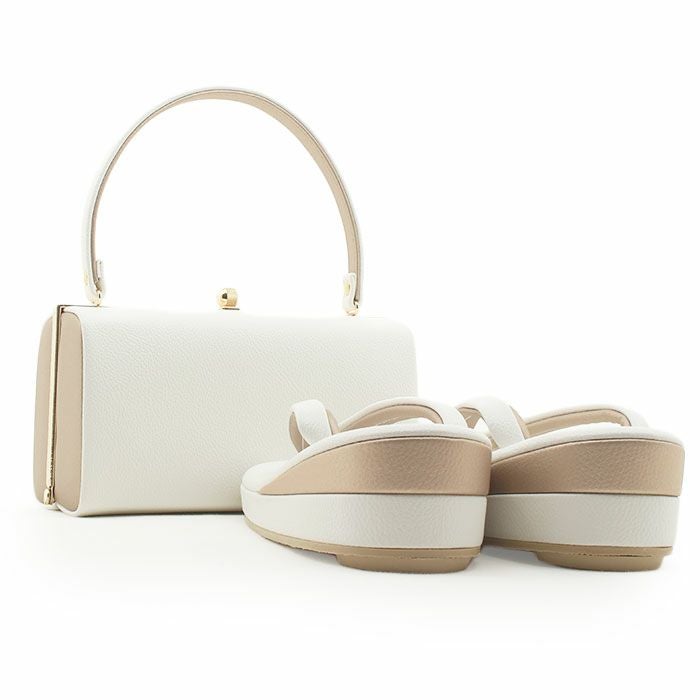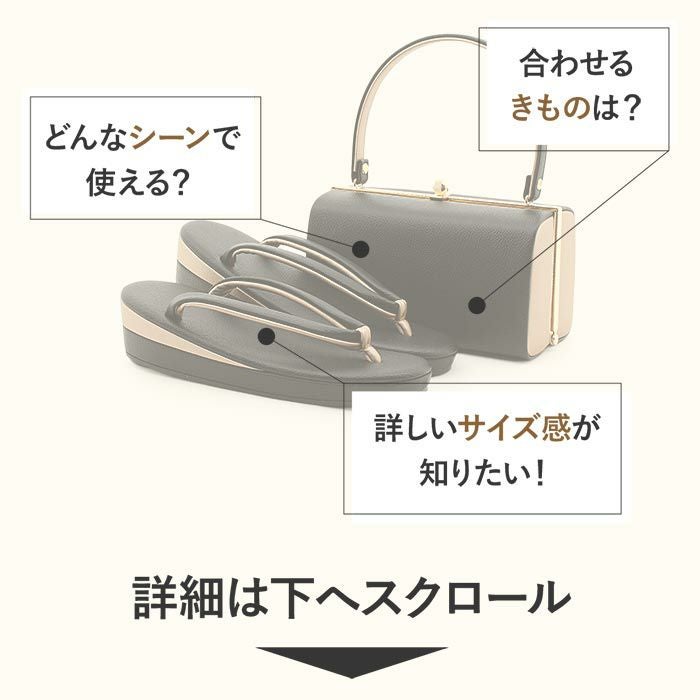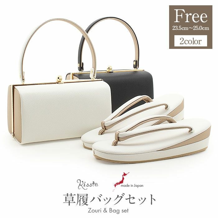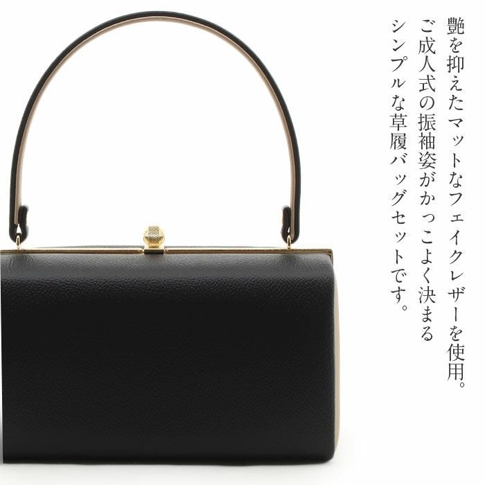 ひとつひとつ手仕事で仕上げることによって痛くない草履・美しいバッグを実現した日本製の 振袖用草履バッグセットです。 成人式や結婚式での振袖や卒業袴といった、華やかなおきものの装いに合わせていただけます。 マットな質感のフェイクレザーを使用した振袖用草履バッグセット。 シンプルで飽きのこない無地柄のデザインはありそうでなかった逸品です。 どんな振袖にも合わせていただけるバイカラーの配色となっているので、コーディネートの幅も広がります。 お色は全2色で、シックな配色の「ブラック×ゴールド」と、可憐な印象の「ホワイト×ゴールド」。 どちらもワンランク上のこだわりの振袖コーディネートが楽しめます。 バッグは、小ぶりなお財布やスマートフォン、ハンカチや口紅などの手放せない手荷物が入る程良い容量。 でも見た目が大きすぎることはなく、すっきりとしたサイズ感なのが嬉しいポイントです。 お母様やお姉様の振袖を受け継いで、草履バッグセットを新調したコーディネートにするお嬢様も多くいらっしゃいます。 レンタル店や写真館などでは貸し出しの草履バッグセットもありますが、レンタルではなかなか出回らない繊細なお作りやお洒落なデザインの草履バッグは振袖コーデの中でもぱっと目を引く存在になるでしょう。 華やかな装いを楽しみたい日のおともに、ぜひお手に取っていただきたい草履バッグセットです。