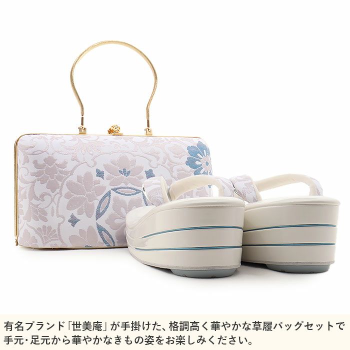 着物雑誌でもお馴染みの「世美庵」ブランドの振袖用草履バッグセットです。 「世美庵」は国内唯一の草履自社生産にこだわるメーカーブランドで、匠の技術が結集され、貴賓の風格漂う最高級草履バッグセットです。 草履の芯は、ブルーのラインが埋め込まれた3枚芯を採用。 かかとの高さは約6.0cmのヒール高で、着姿を美しく魅せ、歩きやすく足への負担を軽減します。 一足ずつ丁寧に作りあげられた草履は、履きやすさ抜群の「優花緒」。 衝撃にも強く長時間の歩行も疲れを感じさせない逸品です。 フォルムがスクエア型の上品なバッグは、折り財布やスマートフォンなどが入る大きさ。 底面には底鋲が取り付けられており、汚れや傷が付きにくい設計です。 煌めく口金のラインストーンが、お洒落に魅せてくれるバッグです。 お母様やお姉様の振袖を受け継いで、草履バッグセットを新調したコーディネートにするお嬢様も多くいらっしゃいます。 レンタル店や写真館などでは貸し出しの草履バッグセットもありますが、レンタルではなかなか出回らない繊細なお作りやお洒落なデザインの草履バッグは振袖コーデの中でもぱっと目を引く存在になるでしょう。 華やかな装いを楽しみたい日のおともに、ぜひお手に取っていただきたい草履バッグセットです。
