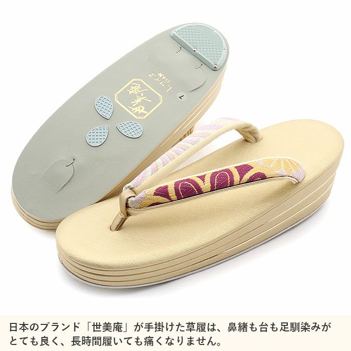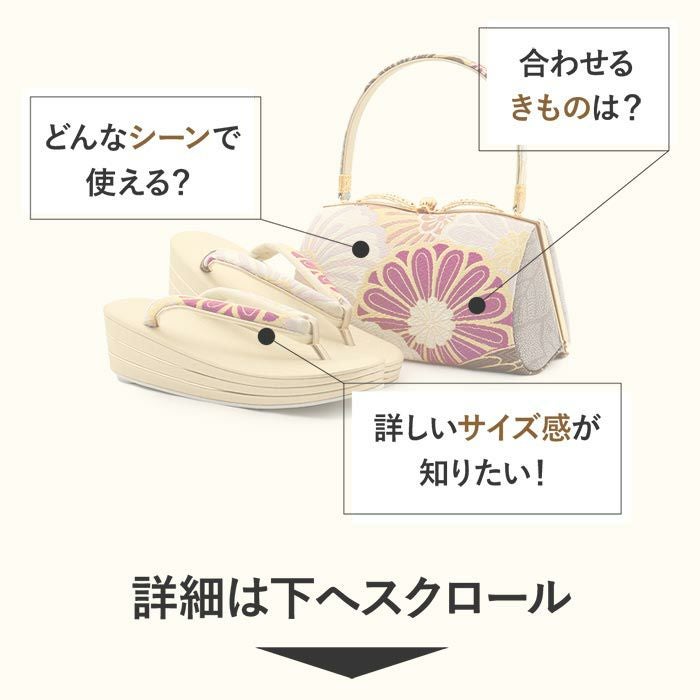着物雑誌でもお馴染みの「世美庵」ブランドの振袖用草履バッグセットです。 「世美庵」は国内唯一の草履自社生産にこだわるメーカーブランドで、匠の技術が結集され、貴賓の風格漂う最高級草履バッグセットです。 草履の芯は、ゴールドのラインが埋め込まれた3枚芯を採用。 かかとの高さは約5.5cmのヒール高で、着姿を美しく魅せ、歩きやすく足への負担を軽減します。 一足ずつ丁寧に作りあげられた草履は、履きやすさ抜群の「優花緒」。 衝撃にも強く長時間の歩行も疲れを感じさせない逸品です。 コロンとしたフォルムが可愛らしいバッグは、折り財布やスマートフォンなどが入る大きさ。 ゴールドに紫系のくすみカラーがお洒落に魅せてくれるバッグです。 お母様やお姉様の振袖を受け継いで、草履バッグセットを新調したコーディネートにするお嬢様も多くいらっしゃいます。 レンタル店や写真館などでは貸し出しの草履バッグセットもありますが、レンタルではなかなか出回らない繊細なお作りやお洒落なデザインの草履バッグは振袖コーデの中でもぱっと目を引く存在になるでしょう。 華やかな装いを楽しみたい日のおともに、ぜひお手に取っていただきたい草履バッグセットです。