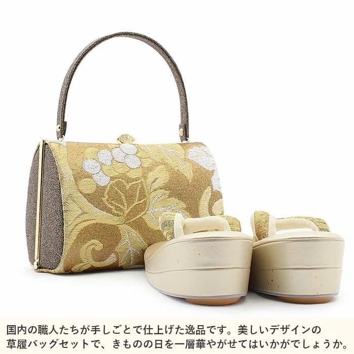 成人式や結婚式での振袖や卒業袴といった、華やかなおきものの装いに合わせていただける日本製の振袖用草履バッグセットです。 手仕事で仕上げることによって痛くない草履・美しいバッグを実現した、大切な日のための和装アイテムです。 繊細で上質な織感を楽しんでいただける、振袖用帯地を使用したお洒落なバッグ。 金銀糸で織り込まれた柄ゆきが煌めき、側面や持ち手にはグリッターラメがポイントになっています。 バッグの開口部分は繊細な装飾を施した口金が煌めく格調高い雰囲気。 一本手で持ちやすいバッグは、小ぶりなお財布やスマートフォン、ハンカチや口紅などの手放せない小物が入る容量。 でも見た目が大きすぎることはなく、すっきりとしたサイズ感なのが嬉しいポイントです。 バッグと同じデザインの草履の花緒が統一感をプラスし、お着物姿をより一層華やかに。 金たたきが煌めく艶やかな草履台は、かかとの高さが約5.5cmとちょうど良い高さです。 上品なデザインのまま、やや幅広の草履は履きやすいのが嬉しいポイント。 足裏の当たる部分はなだらかな曲線のため、前に滑りすぎず、きもの初心者の方も履きやすくおすすめの草履です。 お母様やお姉様の振袖を受け継いで、草履バッグセットを新調したコーディネートにするお嬢様も多くいらっしゃいます。 レンタル店や写真館などでは貸し出しの草履バッグセットもありますが、レンタルではなかなか出回らない繊細なお作りやお洒落なデザインの草履バッグは振袖コーデの中でもぱっと目を引く存在になるでしょう。 華やかな装いを楽しみたい日のおともに、ぜひお手に取っていただきたい草履バッグセットです。