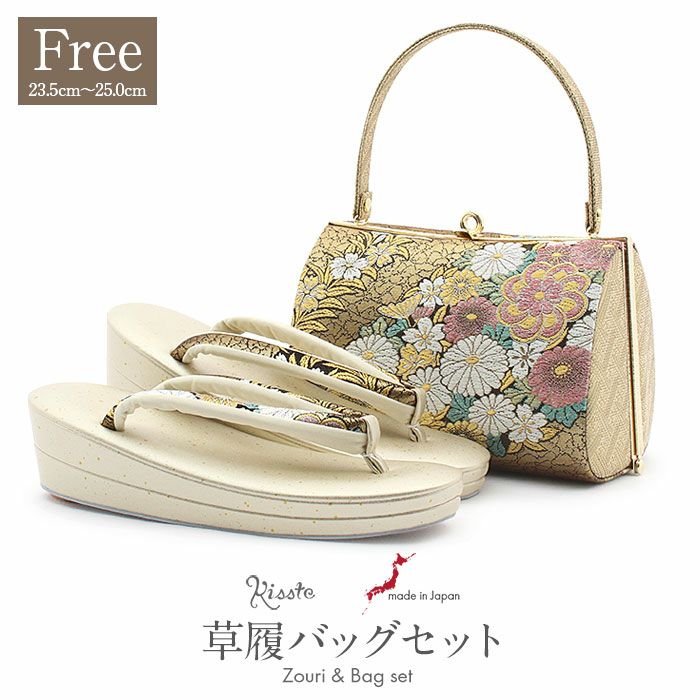 成人式や結婚式での振袖や卒業袴といった、華やかなおきものの装いに合わせていただける日本製の振袖用草履バッグセットです。 手仕事で仕上げることによって痛くない草履・美しいバッグを実現した、大切な日のための和装アイテムです。 繊細で上質な織感を楽しんでいただける、振袖用帯地を使用したお洒落なバッグ。 花尽くしの柄ゆきには、ラメ糸で織り込まれており目を引くデザインとなっております。 バッグの開口部分は金色の口金が煌めく華やかな雰囲気。 一本手で持ちやすいバッグは、小ぶりなお財布やスマートフォン、ハンカチや口紅などの手放せない小物が入る容量。 でも見た目が大きすぎることはなく、すっきりとしたサイズ感なのが嬉しいポイントです。 バッグと同じデザインの草履の花緒が統一感をプラスし、お着物姿をより一層華やかに。 金たたきが煌めく艶やかな草履台は、かかとの高さが約5.5cmとちょうど良い高さです。 上品なデザインのまま、やや幅広の草履は履きやすいのが嬉しいポイント。 足裏の当たる部分はなだらかな曲線のため、前に滑りすぎず、きもの初心者の方も履きやすくおすすめの草履です。 お母様やお姉様の振袖を受け継いで、草履バッグセットを新調したコーディネートにするお嬢様も多くいらっしゃいます。 レンタル店や写真館などでは貸し出しの草履バッグセットもありますが、レンタルではなかなか出回らない繊細なお作りやお洒落なデザインの草履バッグは振袖コーデの中でもぱっと目を引く存在になるでしょう。 華やかな装いを楽しみたい日のおともに、ぜひお手に取っていただきたい草履バッグセットです。