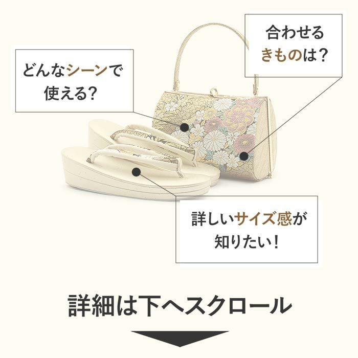 バッグ・花緒:ゴールド、ブラック、ホワイト、くすみピンク、エメラルドグリーン 草履台:ゴールド
