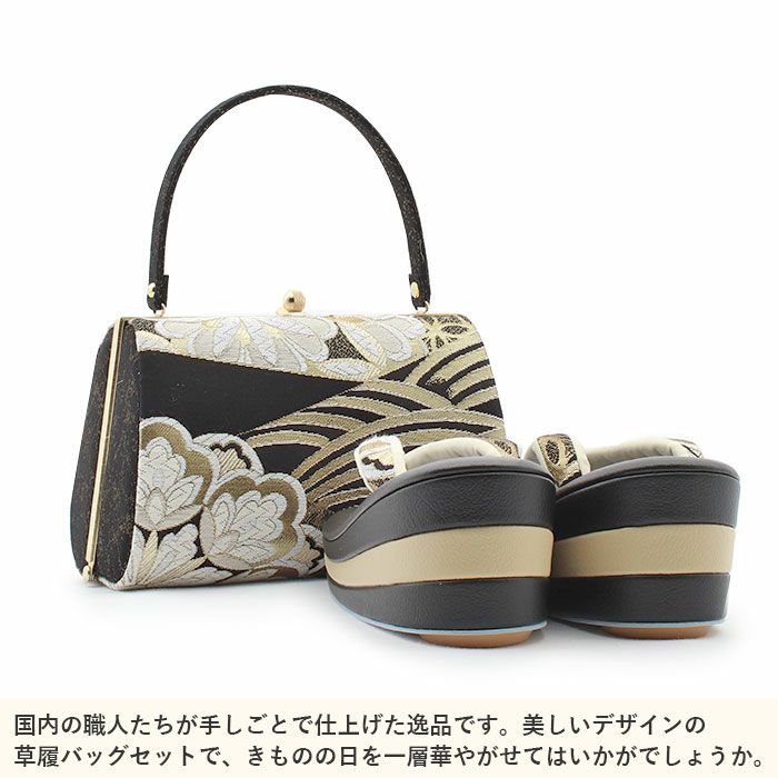 成人式や結婚式での振袖や卒業袴といった、華やかなおきものの装いに合わせていただける日本製の振袖用草履バッグセットです。 手仕事で仕上げることによって痛くない草履・美しいバッグを実現した、大切な日のための和装アイテムです。 繊細で上質な織感を楽しんでいただける、振袖用帯地を使用したお洒落なバッグ。 金糸やラメ糸で織り込まれた柄ゆきが煌めき、ポイントになっています。 バッグの開口部分は金色の口金が煌めく華やかな雰囲気。 一本手で持ちやすいバッグは、小ぶりなお財布やスマートフォン、ハンカチや口紅などの手放せない小物が入る容量。 でも見た目が大きすぎることはなく、すっきりとしたサイズ感なのが嬉しいポイントです。 マットな質感の草履は人気の厚底タイプ。高さのある草履は小柄なお嬢様はもちろん、身長の高いお嬢様の着姿をも美しく魅せます。 鼻緒にはバッグと同じ生地が使われており、上品な輝きとコーディネート全体の統一感を演出します。 足裏の当たる部分はなだらかな曲線のため、前に滑りすぎずきもの初心者の方も履きやすくおすすめの草履です。 お母様やお姉様の振袖を受け継いで、草履バッグセットを新調したコーディネートにするお嬢様も多くいらっしゃいます。 レンタル店や写真館などでは貸し出しの草履バッグセットもありますが、レンタルではなかなか出回らない繊細なお作りやお洒落なデザインの草履バッグは振袖コーデの中でもぱっと目を引く存在になるでしょう。 華やかな装いを楽しみたい日のおともに、ぜひお手に取っていただきたい草履バッグセットです。