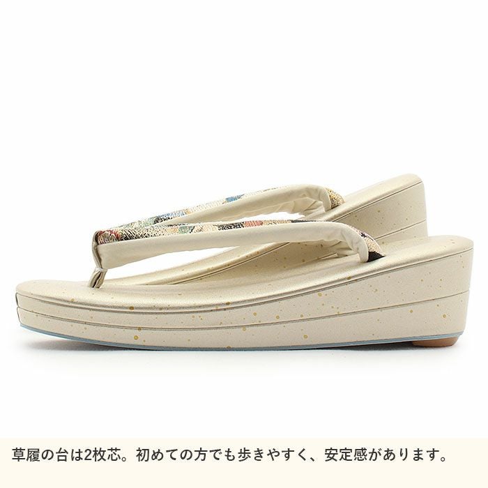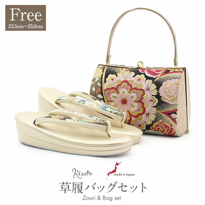 成人式や結婚式での振袖や卒業袴といった、華やかなおきものの装いに合わせていただける日本製の振袖用草履バッグセットです。 手仕事で仕上げることによって痛くない草履・美しいバッグを実現した、大切な日のための和装アイテムです。 繊細で上質な織感を楽しんでいただける、振袖用帯地を使用したお洒落なバッグ。 華紋に薔薇や桜などの花々が織り込まれた、ハレの日に相応しい豪華な柄ゆきです。 バッグの開口部分は金色の口金が煌めく華やかな雰囲気に。 一本手で持ちやすいバッグは、小ぶりなお財布やスマートフォン、ハンカチや口紅などの手放せない小物が入る容量。 でも見た目が大きすぎることはなく、すっきりとしたサイズ感なのが嬉しいポイントです。 バッグと同じデザインの草履の花緒が統一感をプラスし、お着物姿をより一層華やかに。 金たたきが煌めく艶やかな草履台は、かかとの高さが約5.5cmとちょうど良い高さです。 上品なデザインのまま、やや幅広の草履は履きやすい作りになっております。 足裏の当たる部分はなだらかな曲線のため、前に滑りすぎず、きもの初心者の方も履きやすくおすすめの草履です。 お母様やお姉様の振袖を受け継いで、草履バッグセットを新調したコーディネートにするお嬢様も多くいらっしゃいます。 レンタル店や写真館などでは貸し出しの草履バッグセットもありますが、レンタルではなかなか出回らない繊細なお作りやお洒落なデザインの草履バッグは振袖コーデの中でもぱっと目を引く存在になるでしょう。 華やかな装いを楽しみたい日のおともに、ぜひお手に取っていただきたい草履バッグセットです。