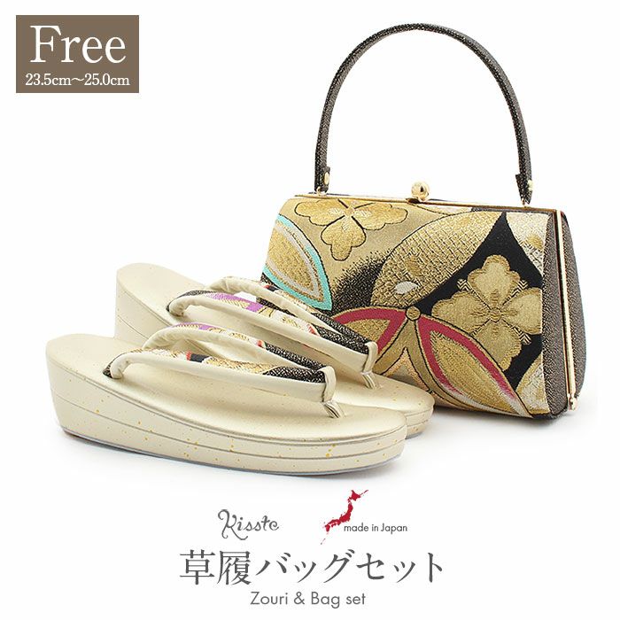 バッグ・花緒:ブラック、ゴールド、ライトグリーン、レッド(ややオレンジかかった)、パープル 草履台:ゴールド