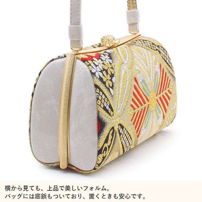 ※実際の商品と同じ色合いに画像修正をしておりますが、環境やモニターの違いにより多少色の違いが出て来ることがあります、ご了承ください。 ※帯地を使用した商品は、商品の性質上どうしても糸のほつれが発生してしまいます。商品不良ではございませんので予めご了承くださいませ。 ※製造するうえで十分に注意しておりますが、どうしても傷や汚れ、染料飛びや染料欠けなどができる場合がございます。また、金具部分は金属の性質上、変色やくすみ、傷や汚れなどがある場合がございます。予めご了承のうえ、お買い求めください。