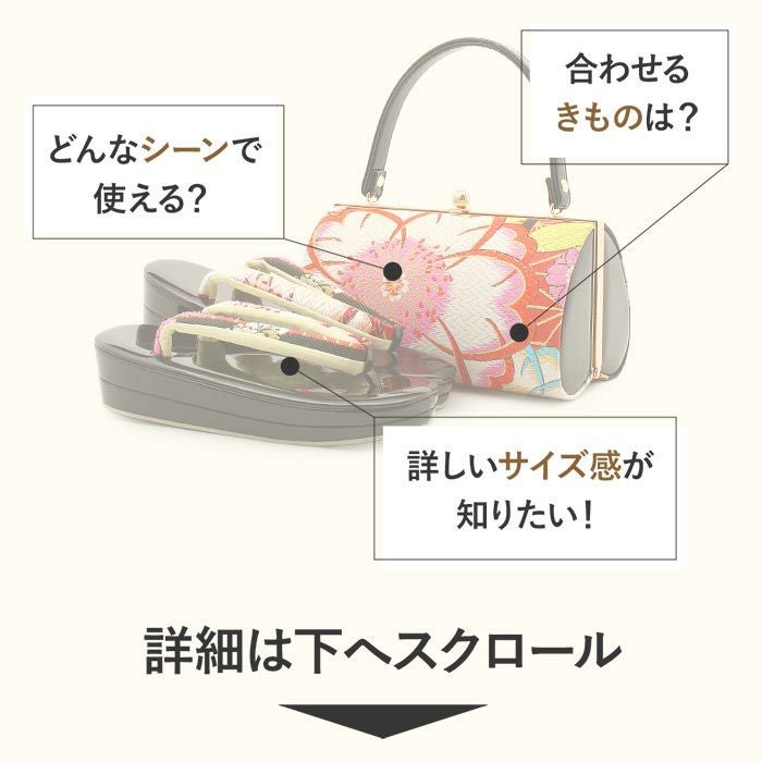 成人式や卒業式に最適な、魅力的な振袖用の草履とバッグのセットをご紹介します。 華やかな色合いが、特別な日をより一層輝かせます。 このエナメル仕上げの草履は、フリーサイズ。 鼻緒にバッグと同じ生地を使った、統一感のあるデザインです。 2枚芯でしっかりとした履き心地を提供し、柔らかなクッション加工で、足への優しさを追求しています。 バッグも振袖用帯地を使用したデザインで、上品さと華やかさを兼ね備えています。 小ぶりなお財布やスマートフォン、ハンカチや口紅など、必要な持ち物が入る容量が特徴です。 お母様やお姉様から受け継いだ振袖に、新しい草履バッグセットを合わせることで、特別な日をより一層彩ることができます。 レンタル店や写真館では見つからない、繊細でお洒落なデザインが、振袖コーデを際立たせます。 あなたの大切なハレの日を、特別なものにする振袖用草履バッグセットです。 ※草履の鼻緒は生地の取り方により、柄の出方が異なります。 お選びいただけませんが、それぞれ華やかなお品です。