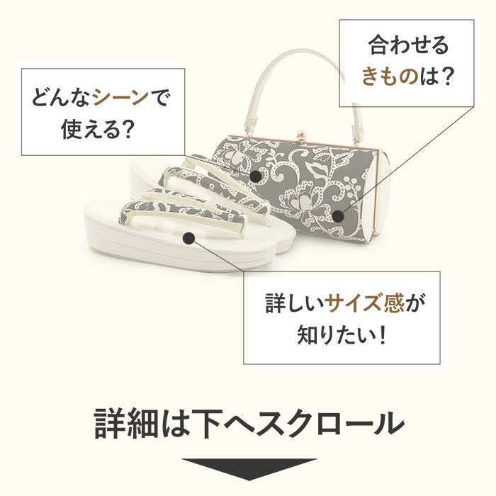 成人式や結婚式での振袖や卒業袴といった、華やかなおきものの装いに合わせていただける草履バッグセットです。 わずかな機会でも新品の草履バッグセットですがすがしくお出かけしていただけるよう、お手頃価格でご用意致しました。 ■草履台は美しい光沢のエナメル素材。すっきりとしたホワイトカラーの二枚芯仕様。 ・安定感がありながらもすっきりとしたフォルムで、美しい立ち姿に。 ・かかとの高さは5cmで着物初心者の方にも扱いやすく、クッション性のある柔らかな履き心地で長時間のご着用も安心です。 ■バッグの形はお選びいただけませんが、どちらも持ちやすく、華やかなお品です。 ・大きく描かれた唐花が黒地に映える、華やかな雰囲気。 ・コンパクトながら小ぶりなお財布やスマートフォン、ハンカチ、口紅などの手放せない手荷物が入る容量。 ・お祝いの席にも合う洗練されたデザインです。 ■おすすめポイント ・草履台とバッグの鼻緒を共布にし、統一感のある上品な装いを演出。 ・式場貸出の草履バッグセットもあるが、真新しいセットで特別な日を気持ちよく過ごせます。 ・華やかな装いを楽しみたい日のおともに、ぜひお手に取っていただきたい草履バッグセットです。