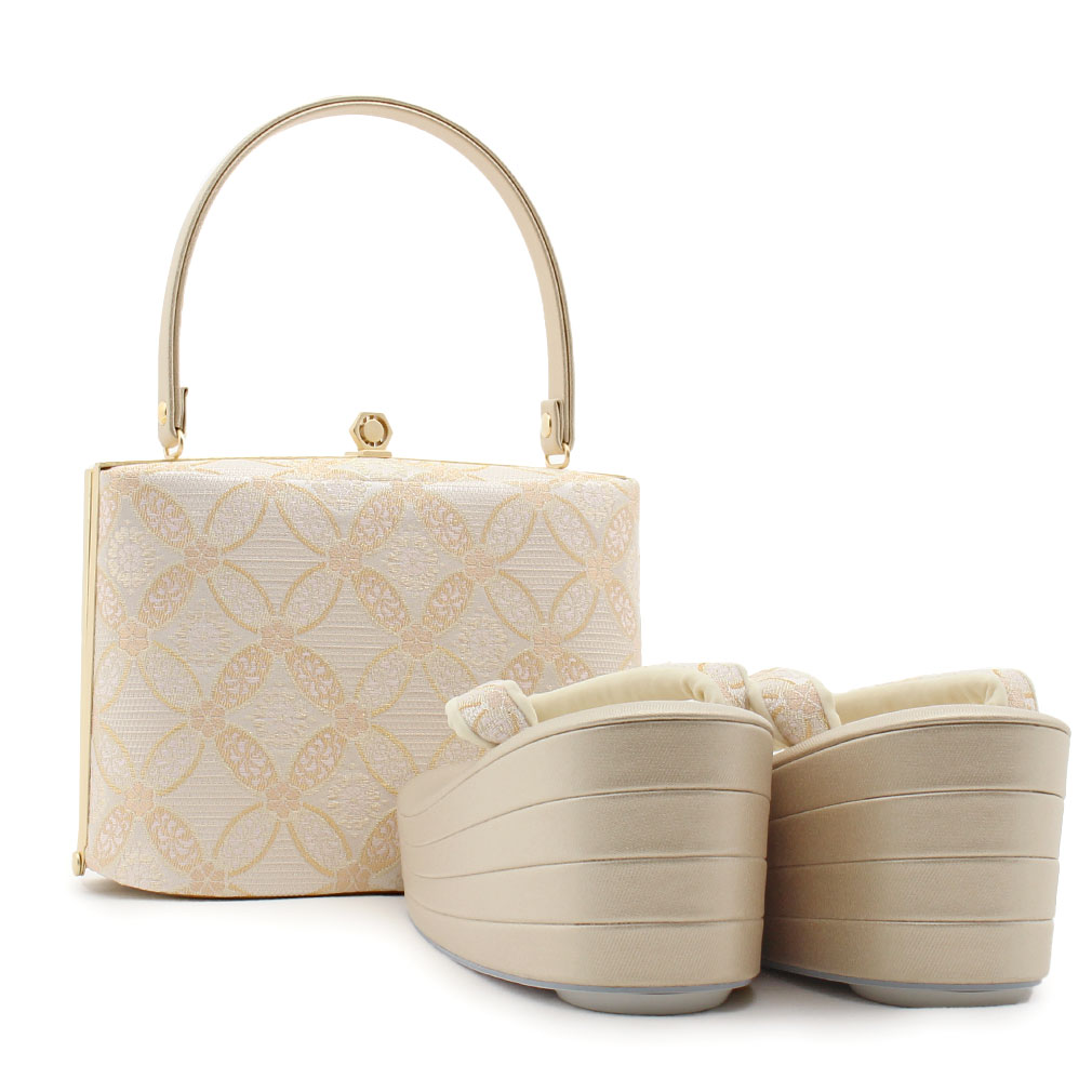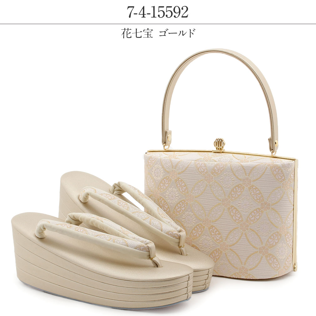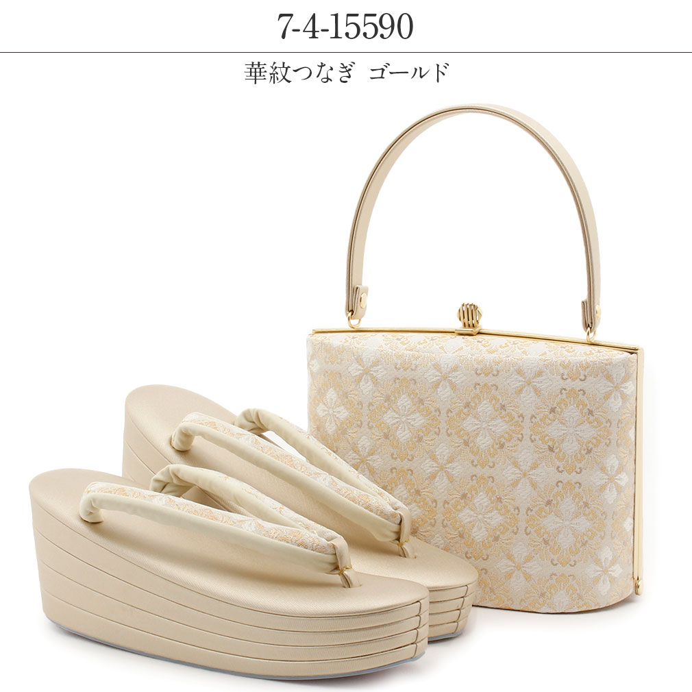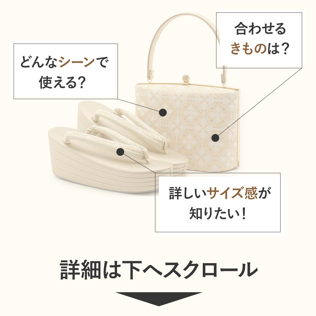 金銀糸を贅沢に織り込んだ生地を使用した、礼装用にふさわしい上品な印象の草履バッグセットです。 七宝やアラベスク柄などが描かれたバッグは、どんな礼装着物にもコーディネートしやすいデザインとなっています。 織り込まれた金糸やラメ糸が角度によって煌びやかな輝きを放ち、お着物姿をさらに豪華に演出します。 バッグの開口部分は装飾を施した艶消しゴールドの口金が格調高く、お着物姿を美しく演出します。 一本手で持ちやすいバッグは、開口部が大きく開きバッグの中が見やすく、袱紗やお財布・スマホなどが入る使い勝手の良い大きさ。 バッグと同じデザインの草履の花緒が統一感をプラスし、お着物姿をより一層華やかに。 4枚芯草履で格式高く、気品漂う足元を演出します。 かかとの高さは約8.0cmと人気の厚底タイプ。 厚底なのでスタイルの良い着姿を演出し、身長が低い方にもおすすめの草履です。 足裏の当たる部分はなだらかな曲線のため前に滑りすぎず、ほど良く柔らかなクッション加工が施され、履き心地が良く、疲れにくい作りになっています。 ご婚礼などのおめでたい席の留袖や訪問着から振袖など、フォーマルからセミフォーマルシーンなど、活用シーンは様々。 年代も問わず、末永くご愛用いただける草履バッグセットを合わせやすい3柄3サイズでご用意致しました。 着姿をスタイルよく魅せてくれる美しい草履を履いて、晴れの日を楽しんでみてはいかがでしょうか。