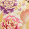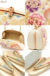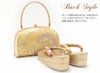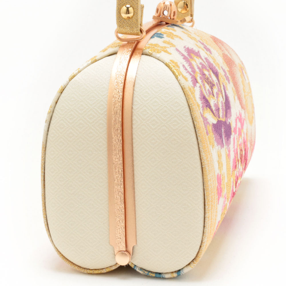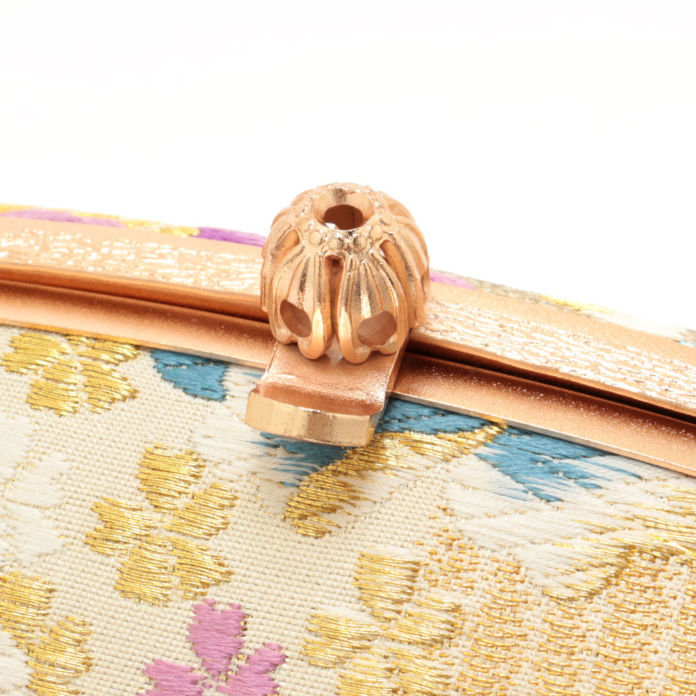 柔らかなクリーム系をベースにしたバッグ生地と花緒には、金糸をふんだんに使用して牡丹や桜などが織り込まれ、彩り豊かで高級感があり振袖スタイルに相応しい華やかさをもつ逸品です。