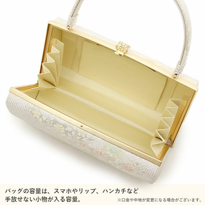 ※実際の商品と同じ色合いに画像修正をしておりますが、環境やモニターの違いにより多少色の違いが出て来ることがあります、ご了承ください。 ※帯地を使用した商品は、商品の性質上どうしても糸のほつれが発生してしまいます。商品不良ではございませんので予めご了承くださいませ。 ※生地の取り方により、柄の出方が異なる場合がございます。 また、製造時期により金具のデザインが若干変更となる場合がございます。 ※製造するうえで十分に注意しておりますが、どうしても傷や汚れ、染料飛びや染料欠けなどができる場合がございます。また、金具部分は金属の性質上、変色やくすみ、傷や汚れなどがある場合がございます。予めご了承のうえ、お買い求めください。