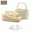 京都西陣の正絹帯地を花緒とバッグに使用した、キステオリジナルの草履バッグセットです バッグの生地には金糸、銀糸や色糸をメインに美しい柄が織り込まれており、 フォーマルに相応しい上品で華やかさのあるデザインです。 金糸、銀糸が角度によって煌びやかな輝きを放ち、お着物姿をさらに美しく演出します。 バッグと同じデザインの草履の花緒が統一感をプラスしています。 草履は高級4枚芯。艶やかなハイヒールが足元を豪華に演出します。 かかとの高さは約8.0cmで、ソフト加工が施された履きやすい逸品です。 バッグのサイズは折り畳みのお財布や携帯電話などお祝いの席に必要な貴重品が入るちょうどよい大きさ。 口が多きく開くので荷物や小物類も取り出しやすく、使い勝手のよい設計となっております。 結婚式や披露宴の黒留袖や色留袖、訪問着をはじめ、入学式やパーティーなどフォーマルなシーンで幅広くご利用いただけます。 年代も問わず、末永くご愛用いただける草履バッグをぜひお客様の目でお確かめ下さい。