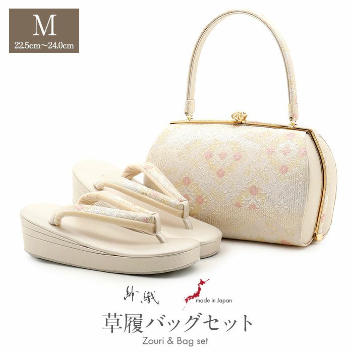 5. 草履バッグセット 留袖用 訪問着用 草履バッグ 紗織 沙織 Mサイズ シルバー シャンパンゴールド 花文 雲取り 1の3枚芯 日本製 パールトーン加工