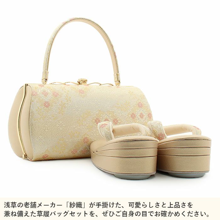 ◆東京・浅草製の伝統と格調を誇る【紗織】ブランド◆ 結婚式の黒留袖や色留袖、訪問着などのフォーマルなおきものの装いに合わせていただける 履きものどころ・浅草の有名草履バッグセットブランドの「紗織」が手掛ける礼装用草履バッグセットです。 職人がこだわって作った草履は、履きやすさを重視し、クッション性に優れ、長時間の歩行でも足の疲れを軽減します。 バッグは、小ぶりなお財布やスマートフォン、ハンカチや口紅などの手放せない手荷物が入る容量。 繊維1本1本に抗菌効果 防臭効果もあるパールトーン加工(撥水加工)を施し、風合いや光沢、美しさを保ち長くご愛用いただけます。 また、底鋲もついて、畳や机に置くときにバッグ本体を擦ってしまうのを防ぐことができます。 式場などでは貸し出しの草履バッグセットもありますが、やはりおめでたい席や礼装の場面で真新しい綺麗な草履バッグセットを身につけていることでいい気分で過ごせます。 フォーマルな装いを楽しみたい日のおともに、ぜひお手に取っていただきたい「紗織」ブランドの草履バッグセットです。