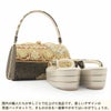 バッグ本体・鼻緒表:絹65% ポリエステル(金銀糸含む)35% バッグ裏地:ナイロン100% 口金:鉄 草履本体:合成皮革 鼻緒裏:ナイロン100% 芯材:コルク 底材:合成皮革