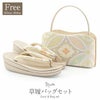 ■ 晴れの日に、品格という名のきらめきを ■ フォーマルな装いに、確かな格と華やぎを添える礼装用草履バッグセット。 バッグと草履鼻緒には、西陣織の帯地を使用し、シルバーやホワイトを基調に、七宝・華紋文様を繊細に織り表しました。 上品にきらめく金銀糸と、柔らかな色調のパステルカラーが印象的な存在感を放ち、格式ある場にふさわしい美しさを演出します。 草履は、足元を美しく見せるベージュゴールドの二枚芯。 程よい高さと安定感があり、見た目の美しさと歩きやすさを兼ね備えています。 結婚式や式典など、大切な一日に自信をもってお使いいただけるセットです。 ーおすすめポイントー ● 西陣織帯地×金銀糸による、上質で奥行きのある表情 ● 七宝・華紋文様がもたらす、吉祥感と華やぎ ● シルバー・ホワイト基調で、きものの色柄を選ばず合わせやすい ● ベージュゴールドの二枚芯草履で、安定感と美しい立ち姿を両立 装いを引き立て、記憶に残る一日へ――大人のための礼装用草履バッグセットです。