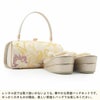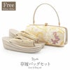 ■ やわらかな金の輝きに、花唐草の優美を添えて ■ 格式あるフォーマルシーンに、やさしく華を添える礼装用草履バッグセット。 バッグと鼻緒には、西陣織の帯地を使用し、ゴールドとアイボリーを基調に、流れるような花唐草文様を繊細に織り上げています。 穏やかな色合いの中に、金銀糸の上品なきらめきが映え、控えめでありながら印象に残る佇まいに仕上がっています。 草履は、足元を美しく見せるベージュゴールドの二枚芯。 程よい高さと安定感があり、見た目の美しさと歩きやすさを兼ね備えています。 結婚式や式典など、大切な一日に自信をもってお使いいただけるセットです。 ーおすすめポイントー ● 西陣織帯地×金銀糸による、上質で奥行きのある表情 ● パープルやブルーを使った花唐草文様が生む、優雅でやさしい華やぎ ● ゴールド・アイボリー基調で、きものの色柄を選ばず合わせやすい ● ベージュゴールドの二枚芯草履で、安定感と美しい立ち姿を両立 上品な輝きと優美な文様が、大人の晴れ姿を上品に引き立てます。