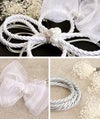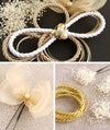 成人式や結婚式での振袖や卒業袴といった、華やかなおきものの装いに合わせていただけるWatmosphereの髪飾りです。 Watmosphere(ワトモスフィア)は、日本の伝統的な髪飾りやかんざしを現代風にアレンジした髪飾りブランド。 信頼の日本製で細部まで丁寧に作りこまれており品質も良く、大事な日を彩る華やかなアクセントにぴったりの髪飾りです。 ゴールド・シルバー それぞれワントーンでロープや水引でシックな印象を演出。花なしのセットでありながら、水引やチュール、パールが煌めくモダンな華やぎがあります。 すべてUピンで扱いやすく、シニヨンなどのアップスタイルはもちろん、ハーフアップや編み下ろし、ポニー、ショートやボブといったどんな髪型でも可愛らしく飾ってくれます。 お母様の振袖(ママ振り)やお姉様の振袖を受け継いで、髪飾りなどの小物を新調したコーディネートにするお嬢様も多くいらっしゃいます。 レンタルの振袖であったり譲りものの振袖をお召しの機会であっても一つでもこだわって選んだアイテムがあるとお慶びの席のご気分が高まりますし、お洒落なデザインの髪飾りは振袖コーデの中でもぱっと目を引く存在になるでしょう。 華やかな装いを楽しみたい日のおともに、ぜひお手に取っていただきたい髪飾りです。