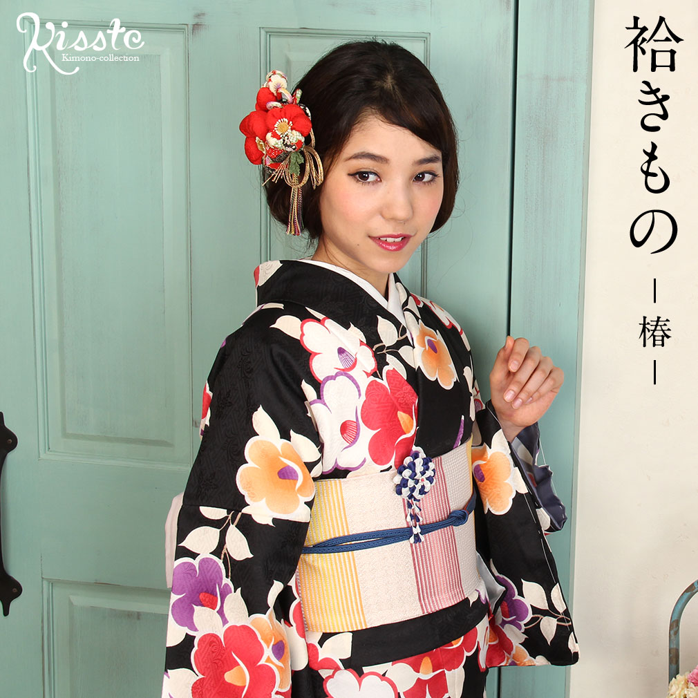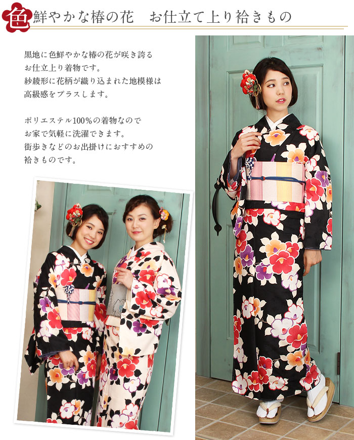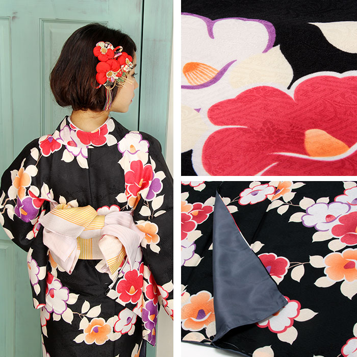 着物 洗える袷着物 お仕立上がり <椿×黒> プレタ着物 着物 きもの 洗えるプレタ ポリエステル Sサイズ Mサイズ Lサイズ フリーサイズ 古典 レトロ モダン