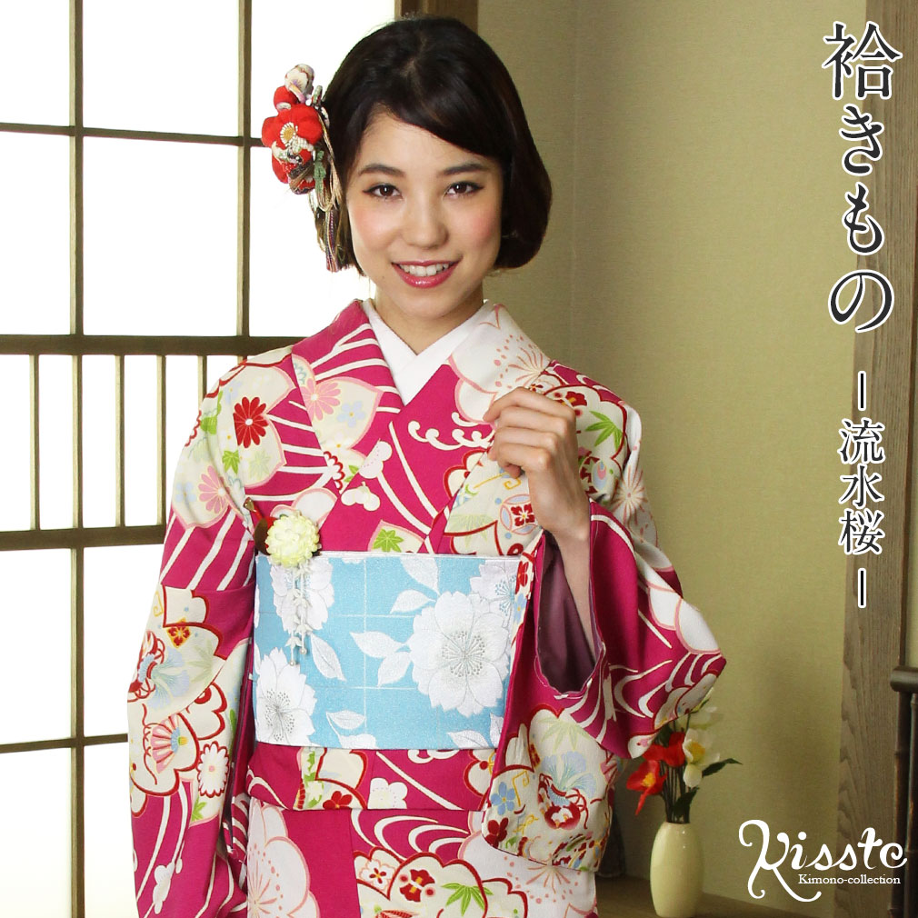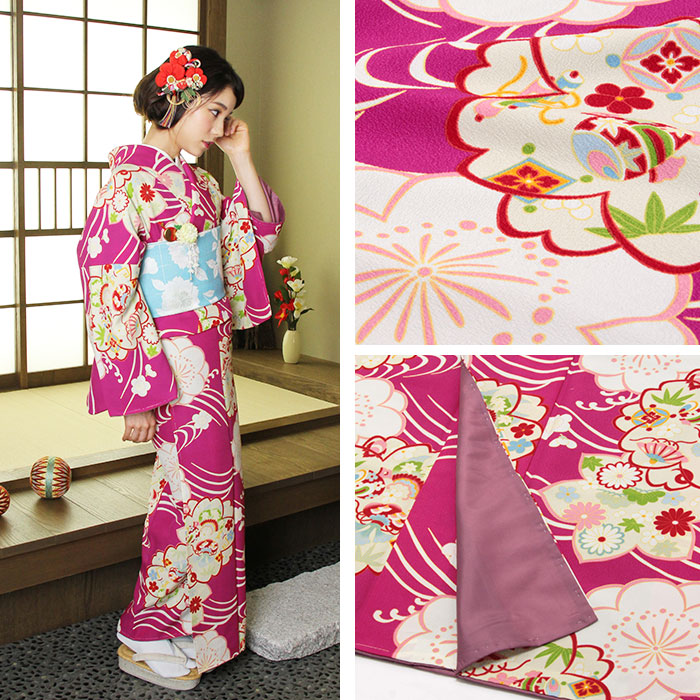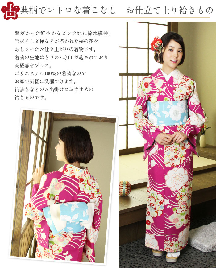 着物 洗える袷着物 お仕立上がり <流水桜×フューシャピンク> プレタ着物 着物 きもの 洗えるプレタ ポリエステル フリーサイズ 古典 レトロ モダン