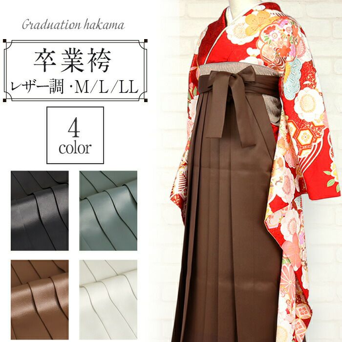 ■卒業式などのハレの日を彩る、おしゃれなレザー調袴スタイル■ 上品さの中にモダンな雰囲気を添える、レザー調生地の卒業袴。 生地は厚すぎず柔らかさがあり、一般的な袴よりもスタイリッシュな印象です。 落ち着いた色合いが振袖や二尺袖に美しく調和し、古典的なママ振りにも合わせやすく、コーディネートの幅を広げます。 ●素材感:レザー調のニュアンスを取り入れたモダンな生地感 ●風合い:厚すぎず柔らかな着心地で、快適にお召しいただけます ●仕立て:行灯袴(あんどんはかま)仕様。仕切りがないため、振袖など丈の長い着物とも相性が良く、スカート感覚で着用可能 ●お手入れ:正絹と異なり、ご自宅でも扱いやすい上質ポリエステル。汚れを気にせず安心して楽しめます ●安心仕様:後ろ側に伸縮性のあるヘラ付き。袴下帯と背中の間に差し込むことで着崩れを防ぎ、万が一後紐が解けても袴が落ちにくい設計 ●カラー展開:全4色(落ち着きのある定番カラーから、トレンド感あるニュアンスカラーまで) ●サイズ展開:M・L・LLの3サイズをご用意 ●おすすめシーン:卒業式・前撮り・謝恩会など特別な一日に シンプルながらも存在感のあるデザインは、振袖や二尺袖の華やかさを引き立て、よりスタイリッシュな卒業スタイルを演出します。 届いてすぐに使えるお仕立て上がり袴で、大切な一日を上品に彩ってください。