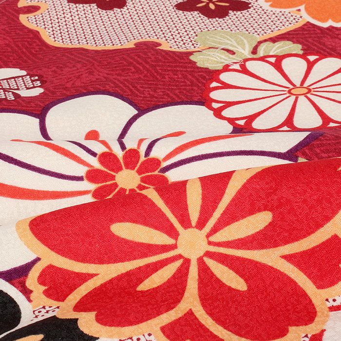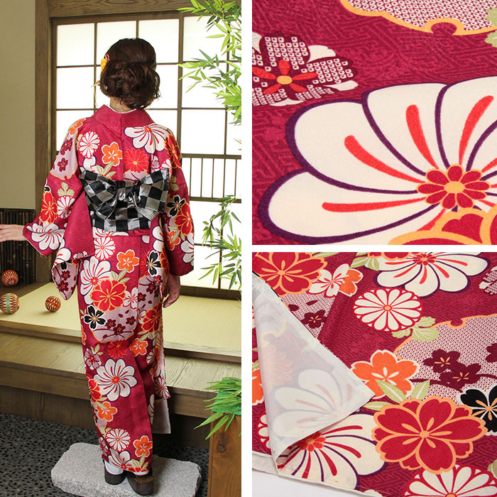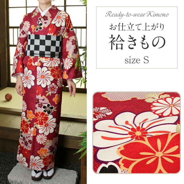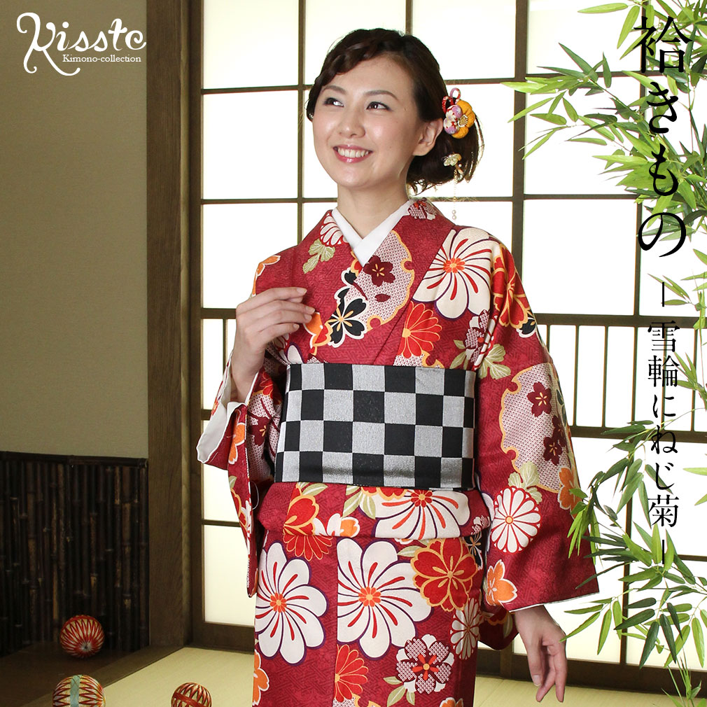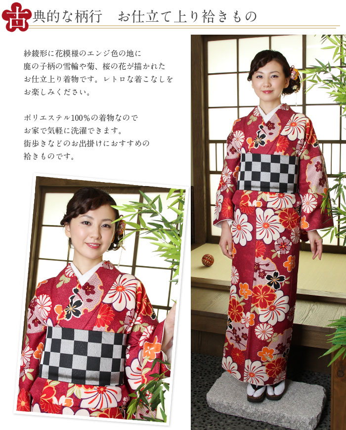 着物 洗える袷着物 お仕立上がり <雪輪にねじ菊×エンジ> プレタ着物 着物 きもの 洗えるプレタ ポリエステル Sサイズ Mサイズ Lサイズ フリーサイズ 古典 レトロ モダン