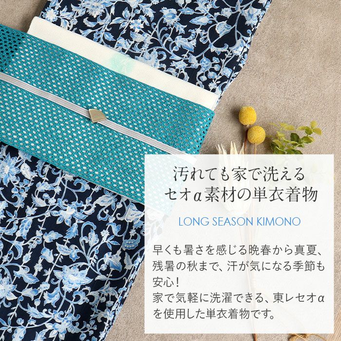 春の汗ばむ陽気から真夏、残暑の秋まで着られる 着物 洗える 単衣 セオアルファ 夏着物 裄丈66 裄丈68 夏用 薄物 セオα 日本製 M L 紺 更紗 唐花 広衿仕立て