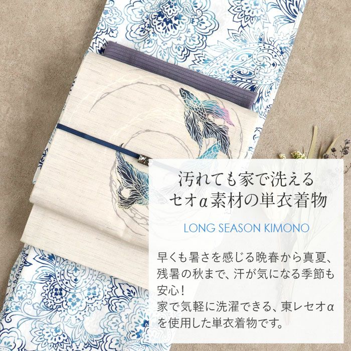 日本の暑い時期を涼やかに彩る夏の着物。東レのセオαを使用した洗える着物『月下美人』シリーズです。 夏着物や浴衣として盛夏に着るのはもちろん、近年気温が高い日が多い単衣着物シーズンの晩春~秋ごろまで長い期間でご着用いただけます。 東レのセオαは夏の衣服や肌着スポーツウェアなどに使われる吸水・速乾性の高い合成繊維です。 綿よりも汗をサッと吸収し素早く発散。肌にまとわりつく不快さを防ぎ、爽やかな着心地が楽しめます。 サラサラとした清涼感のある生地は適度なハリとコシがあり、着物姿を美しく保つことが出来ます。 自宅で洗濯できるので、いつでも清潔。シワもできにくい素材なので、ノーアイロンで快適に着用できます。 控えめで上品な柄ゆきですので、様々な帯や小物と相性抜群。 直接着れば、浴衣として活躍します。 また、衿巾を調整できる広衿仕立てなので、衿襦袢と合わせて着物としてもお楽しみ頂けます。 暑い季節の着物ライフが充実する機能性とコーディネートに優れた一枚、ぜひ一度お試しください。