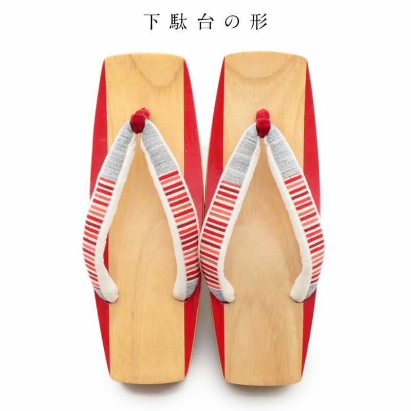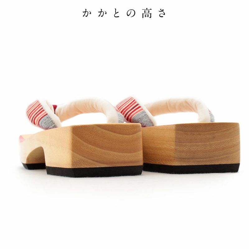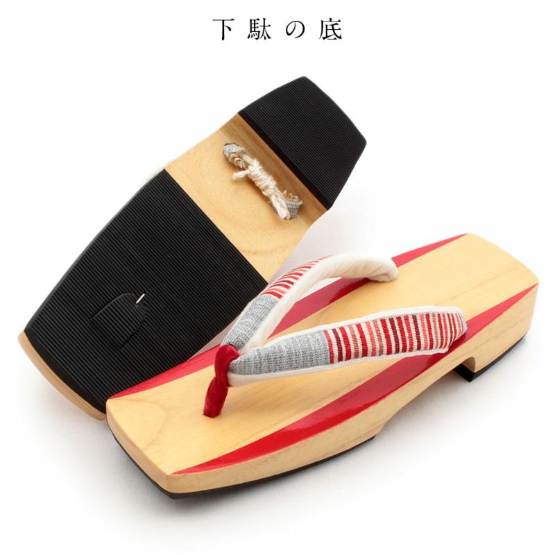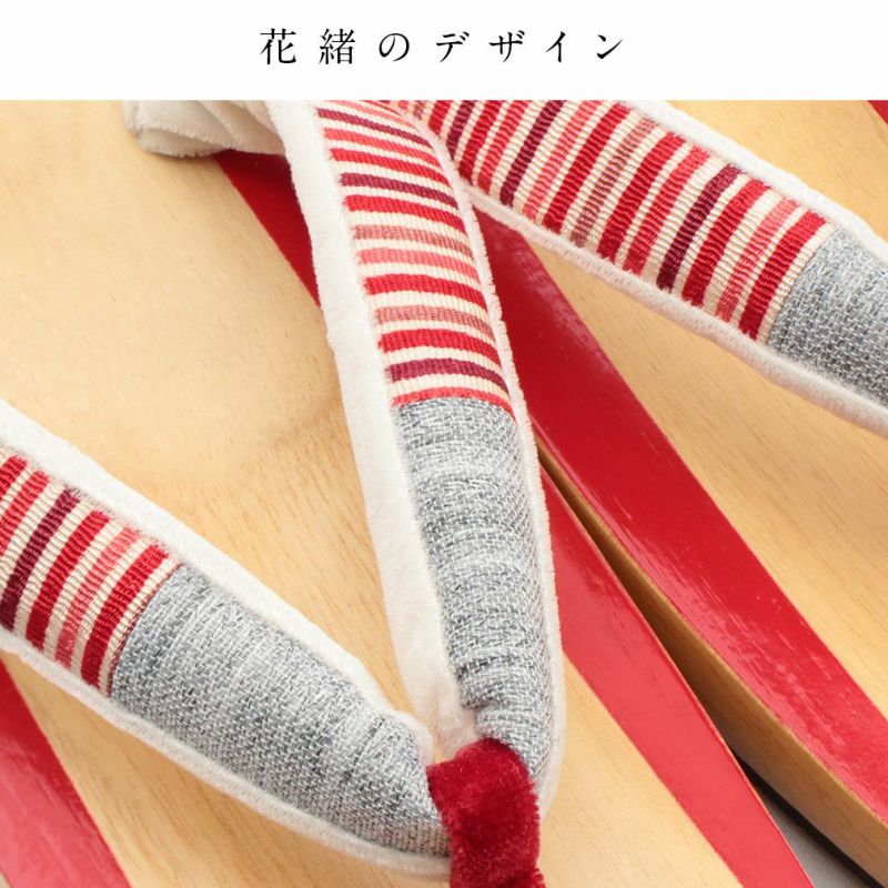 下駄台に鮮やかな赤ラインが彩られた、華やかで個性的な下駄をご用意いたしました。 赤ラインがちらりと見えて小粋でお洒落な印象に。 花緒は赤系の縦縞模様と異素材のグレー地を使用したカラフルな色使い。 裏地は起毛素材で履き心地もふんわりと柔らかです。 とても軽く歩きやすい形ですので、足への負担も少なく疲れを軽減させます。 安心の日本製で、裏にはしっかりと滑り止めも付いておりますが、軽やかさは損なわず、夏の足元にピッタリ。 ヒールの高さは約4cmと履きやすさ抜群の下駄草履。 程良い高さで歩きやすく、着姿も美しく見えます。 夏の浴衣シーズンには欠かすことのできない下駄。 こだわりの浴衣姿を楽しみたい方にオススメの逸品です。 ぜひお手元にとり、履き心地をお楽しみください。
