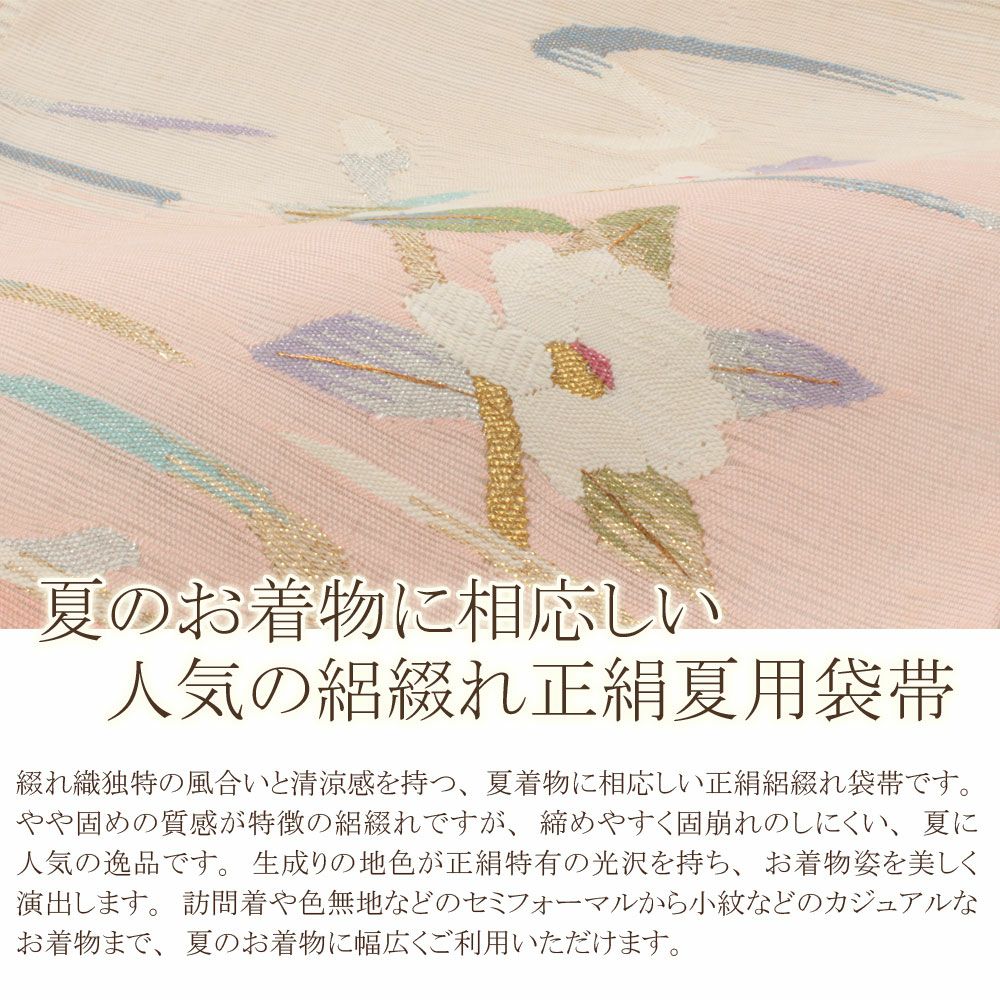 綴れ織独特の風合いと清涼感を持つ、夏着物に相応しい正絹絽綴れ袋帯です。