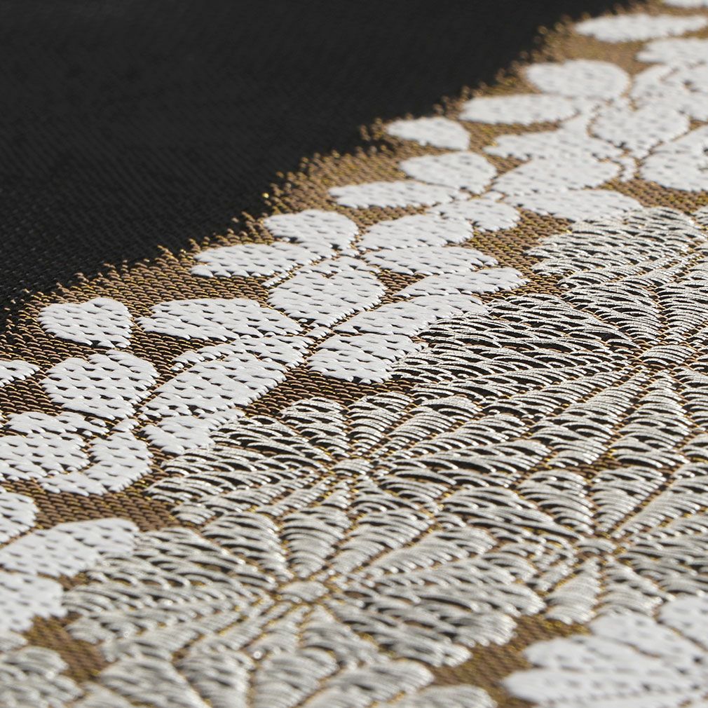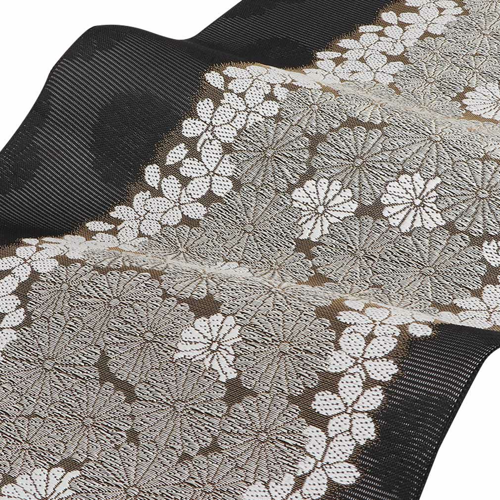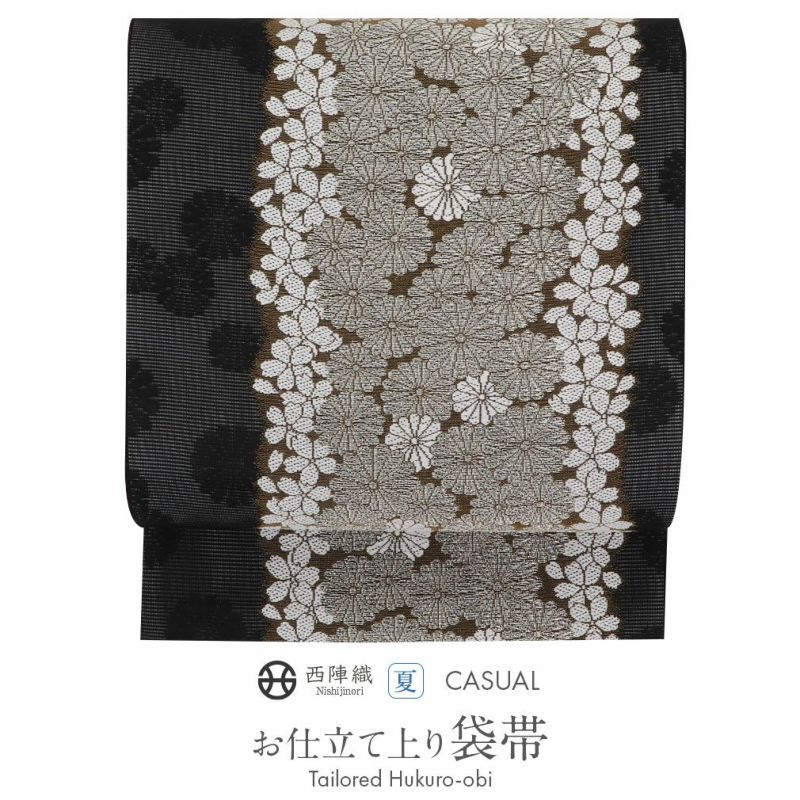 夏季にぴったりの、京都西陣織 沢本織物製の夏袋帯をご紹介します。 上品で繊細な風合いが特徴で、軽くて通気性が良いため、暑い季節でも快適にお召しいただけます。 格式高い黒の生地に桜や菊の小花が織り込まれた上品な袋帯。 着用時の動きによって銀糸が煌めく豪華な雰囲気が、大人の女性に相応しいデザインです。 夏のお洒落訪問着や色無地、小紋などのカジュアルシーンに幅広くご利用いただける逸品です。 特別な日の着物姿を素敵に演出したい方や、上質なお洒落を楽しんでいただける夏袋帯です。 もちろんお太鼓結びが苦手な方や、着物初心者の方にもお勧めの袋帯です。 西陣織ならではの高い技術が生かされた、届いて直ぐに使える夏用のお仕立て上がりの袋帯。 色目を問わず合わせやすい上質な帯で、夏の装いをお楽しみくださいませ。