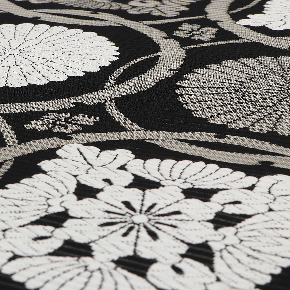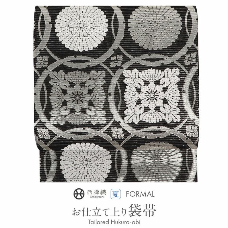夏季にぴったりの、京都西陣織 佐々木染織物の夏袋帯をご紹介します。 上品で繊細な風合いが特徴で、軽くて通気性が良いため、暑い季節でも快適にお召しいただけます。 シックな黒の生地に白・シルバーで輪繋ぎ華紋が織り込まれた上品な袋帯。 着用時の動きによって銀糸が煌めく豪華な雰囲気が、大人の女性に相応しいデザインです。 夏訪問着や付下げ、色無地などのセミフォーマルの着物に合わせて頂けます。 特別な日の着物姿を素敵に演出したい方や、上質なお洒落を楽しんでいただける夏袋帯です。 もちろんお太鼓結びが苦手な方や、着物初心者の方にもお勧めの袋帯です。 西陣織ならではの高い技術が生かされた、届いて直ぐに使える夏用のお仕立て上がりの袋帯。 色目を問わず合わせやすい上質な帯で、夏の装いをお楽しみくださいませ。