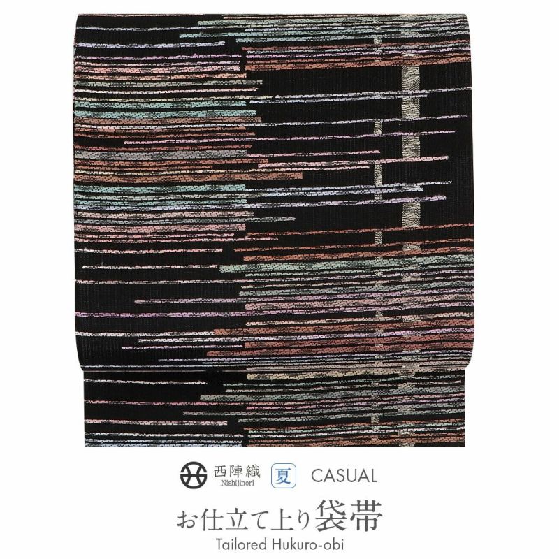 届いて直ぐに使える夏用のお仕立て上がりの袋帯です。 京都西陣で織り上げられ、西陣織の証紙が付いた品質確かな逸品。 絹糸で織られた本商品はしなやかな手触りで締め心地が良く、通気性も優れており初夏から初秋までご利用になれます。 シックな黒の帯地にピンクや橙、緑などでスクエア状のライン模様をカラフルに織り込んだモダンでお洒落な印象の袋帯です。 夏のお洒落訪問着や付け下げ、色無地など幅広くご利用いただけます。 上品で涼やかな夏のお着物にふさわしい袋帯。 ちょっとしたお出掛けにお勧めの商品です。