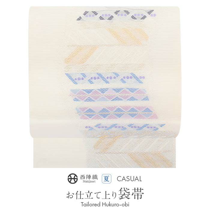 届いてすぐに使える、お仕立て上がりの夏袋帯です。 京都西陣で織り上げられた、西陣証紙のついた確かな品質。 上品な帯ですのでコーディネートしやすく、 またさっくりとした涼し気な絽の帯ですので、初夏・盛夏・晩夏の小紋や紬、色無地、御召などの着物に最適です。 帯は伝統工芸の西陣織にて仕立てられており、染められた糸を複雑に織って模様を作るので、完成までに多数の工程があり、とても手間暇がかかる高級絹織物です。 こうして丁寧に織られた生地は、先染めしてから織っているので、一般的な染色法の後染めより丈夫でシワになりにくいのが特徴です。 絹の帯は何といっても柔らかな風合いで、高級感あふれる美しい帯の質感がお楽しみいただけます。 しなやかな手触りと締め心地の良さを兼ね備え、正絹特有の柔らかな光沢をもつ逸品です。 西陣織の意匠こもった深みのある柄行きが、後ろ姿のお太鼓も胴前も凛とした着姿を演出してくれるでしょう。 ぜひご自身の着物コーディネートに取り入れていただきたい袋帯です。