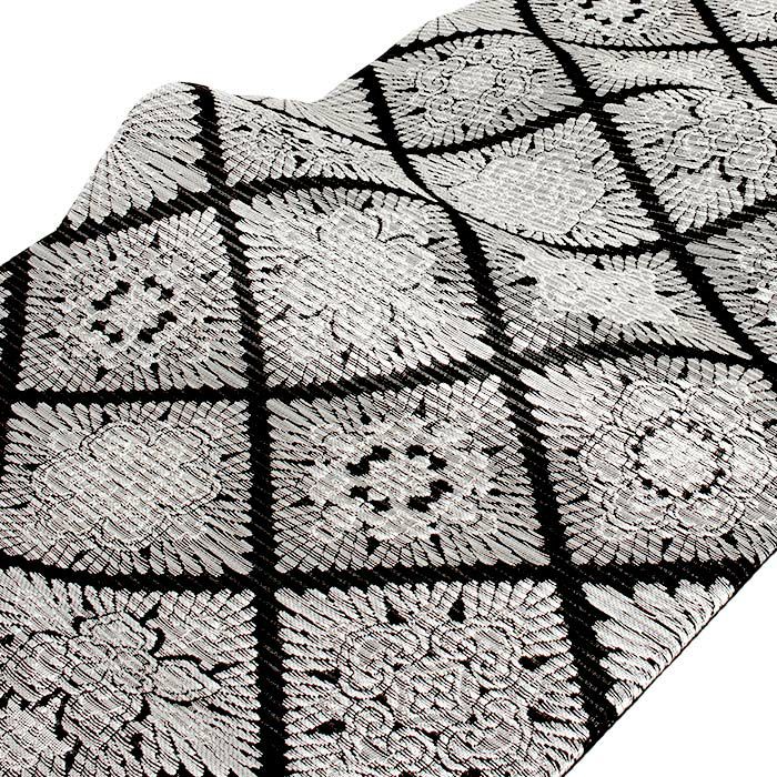 夏の結婚式の留袖や、訪問着などの礼装用にお使い頂ける、西陣織のお仕立て上がり、絽織の夏袋帯です。 ブラックとシルバーを基調とした、華やかで凛とした雰囲気のお祝いの席にぴったりの袋帯です。 帯は伝統工芸の西陣織にて仕立てられており、染められた糸を複雑に織って模様を作るので、完成までに多数の工程があり、とても手間暇がかかる高級絹織物です。 こうして丁寧に織られた生地は、先染めしてから織っているので、一般的な染色法の後染めより丈夫でシワになりにくいのが特徴です。 綿密に織られた西陣織は糸数も多く、ぐっと締まって緩みにくいので、着姿もしゃんと背筋が伸びます。 絹の帯には、銀糸などをふんだんに使用しており、魅入ってしまうほどの美しい輝きが魅力的。 光の当たり方で、絹特有の柔らかな光沢や銀糸が反射し、高級感あふれる美しい帯がお楽しみいただけます。 美しい柄付けで、胴前からお太鼓まで華やいだ印象に。金駒刺繍や艶やかな友禅が施された礼装のお着物に合わせることで、着姿全体がより格調高い印象になるでしょう。 絹の質感と光沢、上品で絶佳なデザインが、大切なお祝いの席を華やかに演出します。 夏結婚式の黒留袖、色留袖を始め、訪問着など、初夏から盛夏、晩夏のフォーマルな装いにピッタリのおすすめの逸品です。