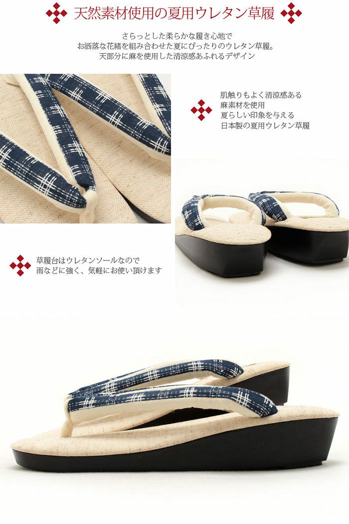 <夏用> ウレタン草履 お洒落用 <天然麻素材> フリーサイズ Lサイズ <紺青&クリームレモン/絣模様> 日本製 夏用お洒落草履