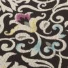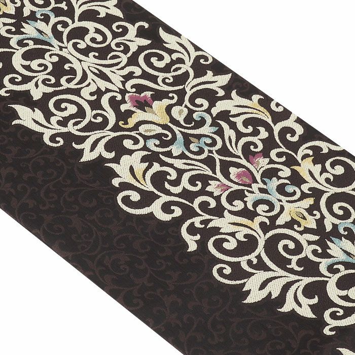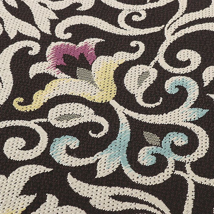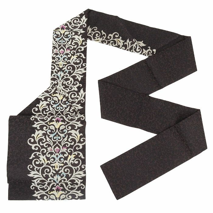 落ち着いた黒の帯地に、白を基調として、水色・ピンク・黄色など鮮やかな色彩で織り込まれたアラベスクの文様がエレガントな印象を与えます。