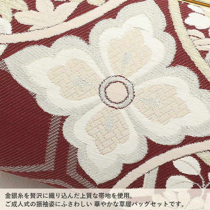 3. 振袖 草履バッグセット 成人式 草履バッグセット 振袖用 M エンジ ゴールド 赤 金 七宝 華紋 エナメル 2枚芯