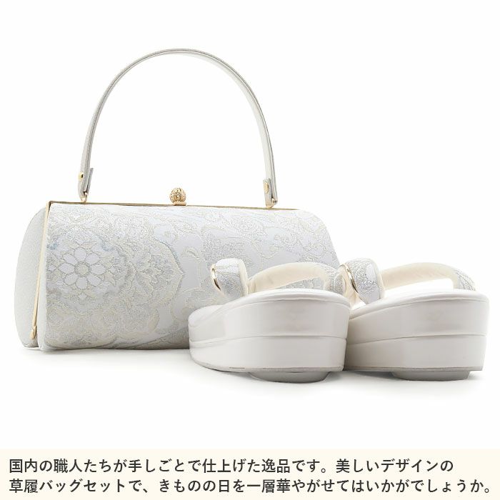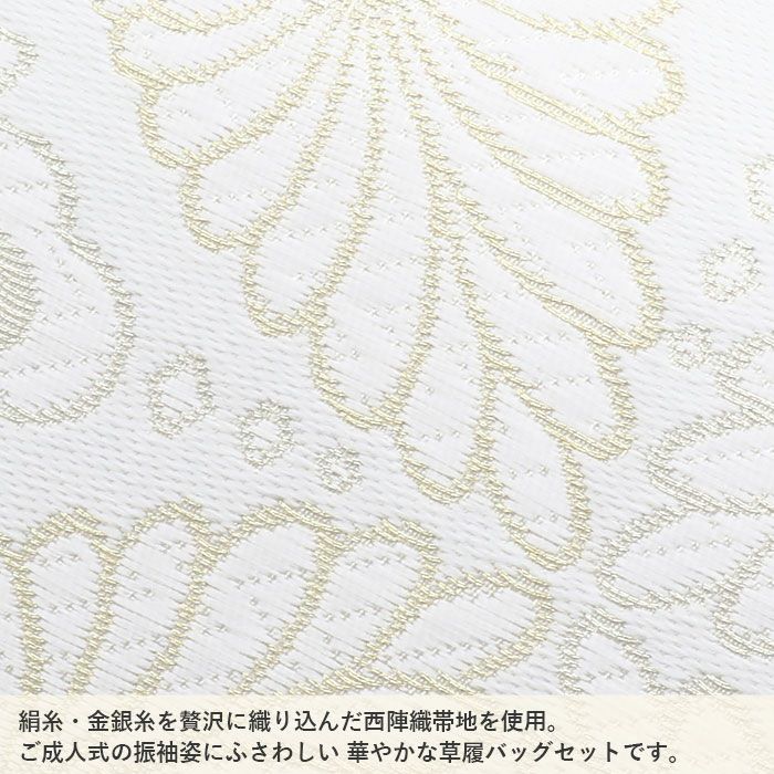 他の画像を見る 痛くなく歩きやすい、初めての方にも安心の履き心地 成人式 振袖 草履バッグセット 草履 バッグ 紗織 沙織 L ホワイト シルバー 白 銀 花七宝 西陣織 正絹帯地 1の3枚芯 日本製 定価 ¥ 36,300 のところ 当店特別価格 ¥ 32,670 税込 在庫切れ (0) 詳細を見る お気に入りに登録する
