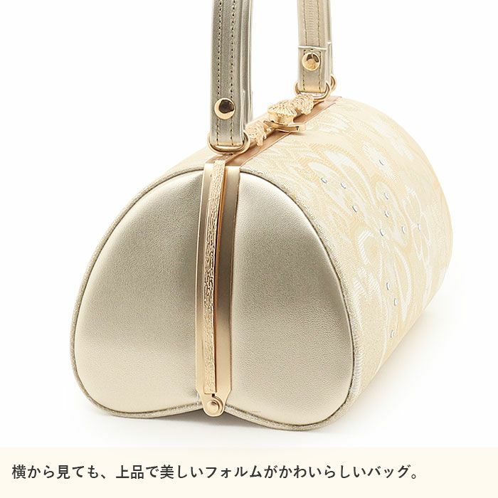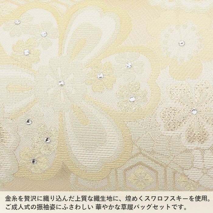 成人式や結婚式での振袖や卒業袴はもちろん、訪問着などフォーマルなおきものにも合わせていただける草履バッグセットです。 わずかな機会でも新品の草履バッグセットですがすがしくお出かけしていただけるよう、お手頃価格でご用意いたしました。 上品なシャンパンゴールドを基調に、丁寧に織り出された華紋と亀甲紋が優雅に広がります。 華紋に散りばめられたスワロフスキーの繊細な輝きが意匠を際立たせ、特別な日の装いを華やかに引き立てます。 ■バッグはコンパクトながら、小ぶりなお財布やスマートフォン・ハンカチや口紅などの手放せない手荷物が入る収納力があり、お祝いの席にもぴったりな洗練されたデザイン。 口金タイプで開閉しやすく、実用性にも優れています。 ■草履はシャンパンゴールドの草履台にバッグと共布の鼻緒を添え、上品で統一感のあるコーディネートを演出。 3枚芯の程よい高さがスタイルを引き立て、クッション性のある柔らかな履き心地で、長時間のご着用も安心です。 華やかな装いを楽しみたい日のおともに、ぜひお手に取っていただきたい草履バッグセットです。