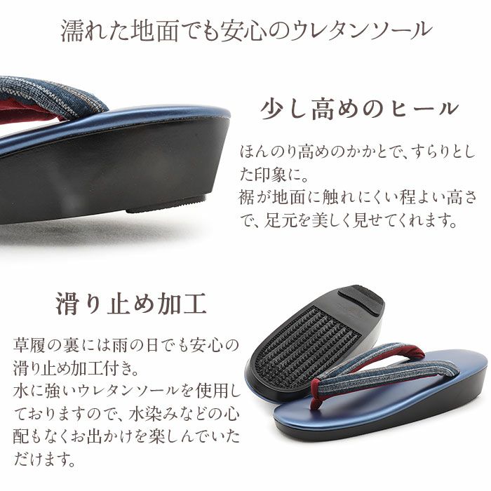 他の画像を見る 痛くない 歩きやすい、初めての方にも安心の履き心地 草履 レディース 普段用 カジュアル草履 ウレタン草履 フリー L ブルーネイビー デニムブルー エンジ 青紺 縞 ウレタン 合皮 1枚芯 日本製 SALE 定価 ¥ 6,600 のところ 当店特別価格 ¥ 6,270 税込 (0) カートに入れる お気に入りに登録する