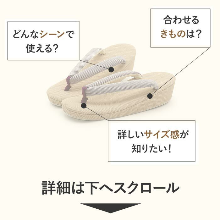 ヘリンボーンと縞模様がお洒落な日本製のクッション草履です。 草履表面は合成皮革を使用し、柔らかく弾力のある履き心地。 花緒は綿入りの布素材を使用し、やわらかな足あたりです。 土踏まずにフィットし、疲れにくいやさしい履き心地を提供します。 かかとの高さは約5cmと程良いヒール高で、歩きやすいソフト加工。 草履底にゴムを使用した草履は、滑りにくく、ふんわりと柔らかな履き心地です。 カジュアル着物に合わせやすいお洒落草履、きものライフの一員にいかがでしょうか。