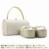 晴れの日を華やかに彩る、日本製の礼装用草履バッグセットです。 上品なシルバーの織地に、ゴールドが織りなす波文様が上品に浮かび上がり、金彩の輝きが洗練された印象を添えます。 熟練の職人により一つひとつ丁寧に仕立てられた日本製ならではの美しい仕上がりで、細部までこだわりが感じられる逸品です。 ■バッグには螺鈿細工がほどこされ、光の角度によってオーロラのような虹色の輝きを放ちます。 貝の自然な光沢が優雅にきらめき、フォーマルな場面にふさわしい気品を漂わせます。 ■草履台はお洒落なシャンパンゴールドで2枚芯仕様。 安定感がありながらもすっきりとしたフォルムで、美しい立ち姿を引き立てます。 鼻緒にはバッグと同じ織生地が施され、統一感のある上品な印象に。 フォーマルな装いを楽しみたい日のおともに、ぜひお手に取っていただきたい草履バッグセットです。